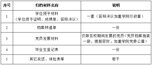 3.装档明细表一份(附件1)、毕业档案材料移交清单一式两份(附件2)及移交目录一份(附件3),均加盖学院公章,装档当天移交档案馆。
